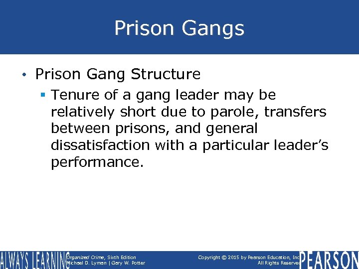 Prison Gangs • Recruitment; § Blood in, blood out • Prison Gang Structure § Controlled by an established system of leadership. Organized Crime, Sixth Edition Michael D. Lyman | Gary W. Potter Copyright © 2015 by Pearson Education, Inc. All Rights Reserved