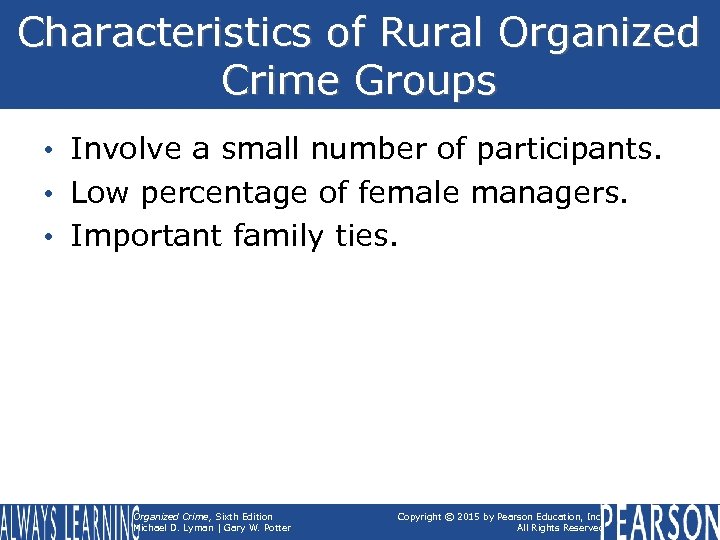 Characteristics of Rural Organized Crime Groups • Involve a small number of participants. • Low percentage of female managers. • Important family ties. Organized Crime, Sixth Edition Michael D. Lyman | Gary W. Potter Copyright © 2015 by Pearson Education, Inc. All Rights Reserved