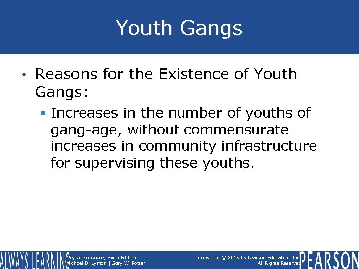Youth Gangs • Reasons for the Existence of Youth Gangs: § Increases in the number of youths of gang-age, without commensurate increases in community infrastructure for supervising these youths. Organized Crime, Sixth Edition Michael D. Lyman | Gary W. Potter Copyright © 2015 by Pearson Education, Inc. All Rights Reserved