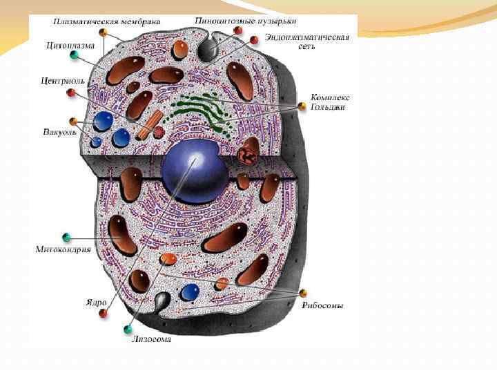 Основні частини клітин цитоплазма і ядро. У ядрі містяться хромосоми — носії спадкових задатків організму. Клітина вкрита мембраною, що забезпечує вибірну проникність речовин. У цитоплазмі містяться органели: ендоплазматична сітка, рибосоми, мітохондрії, лізосоми, комплекс Гольджі, клітинний центр. Органели функціонують взаємоузгоджено, забезпечуючи нормальну життєдіяльність клітини. Отже, клітина є цілісною біологічною системою.