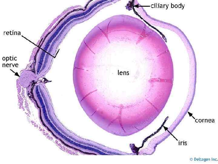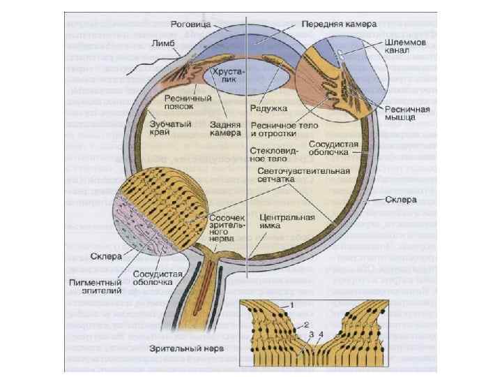 склера Базальный комплекс сосудистая оболочка пигментнй эпителий палочки и колбочки Наружная пограничная мембрана Наружный сетчатый слой наружный ядерный слой Наружный сетчатый слой Внутренний ядерный слой Внутренний сетчатый слой Ганглионарный слой Слой нервных волокон Внутренняя пограничная мембрана Ганглионарная клетка