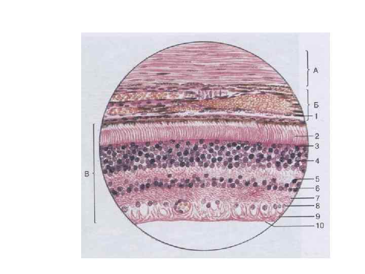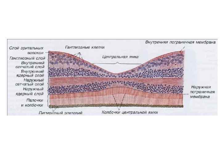 Пигментный слой Слой палочек и колбочек Наружная пограничная мембрана Наружный ядерный слой Наружный сетчатый слой Внутренний ядерный слой Внутренний сетчатый слой Ганглионарный слой Слой нервных волокон Внутренняя пограничная мембрана