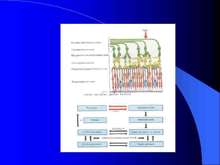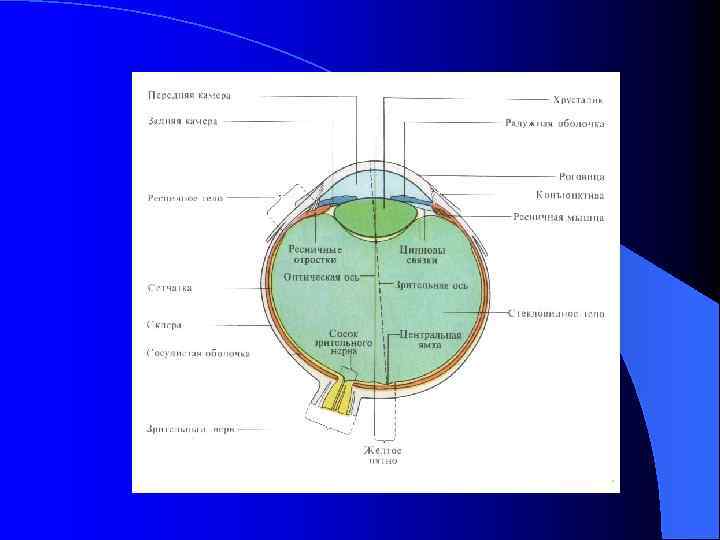 Сетчатка Retina – светочувствительна оболочка, содержит палочки и колбочки l x – слепое пятно (место выхода зрительного нерва), 1, 7 мм в диаметре, в центре видна центральная артерия l пятно, macula – область наилучшего видения, с центральной ямкой l