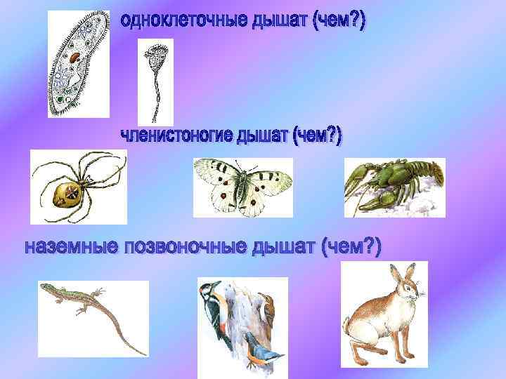Проверьте свои знания 1. Дышит всей поверхностью тела а/ голубь б/ жук-плавунец в/ амёба 2. При помощи трахей дышат а/ насекомые б/ простейшие в/ звери 3. Рыбы дышат а/ лёгкими б/ жабрами в/ трахеями 4. При помощи лёгких дышит а/ медведь б/ эвглена в/ бабочка 5. Всей поверхностью тела не дышит а/ амёба б/ обезьяна в/эвглена