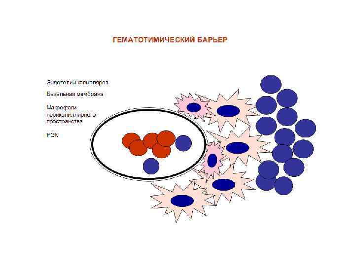 Гемотимусный барьер Структурный состав: 1 - стенка капилляра - эндотелиоцит, базальная мембрана; 2 - перикапиллярное пространство: макрофаги, лимфоциты, тканевая жидкость, базальная мембрана, периваскулярные ретикулоэпителиоциты, клетки-няньки. Барьер проницаем для воды и электролитов, кислорода и углекислого газа, модифицированных в ретикулоэпителиоцитах трофических мономеров углеводного, белкового и жирового метаболизма. Барьер непроницаем для антигенов.