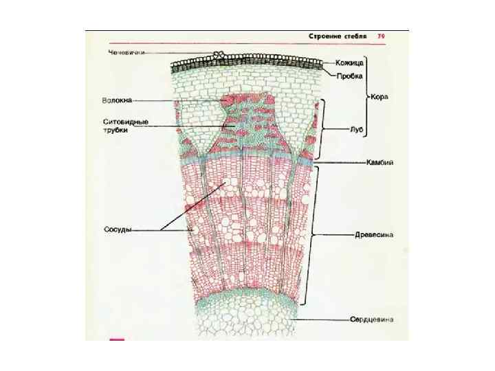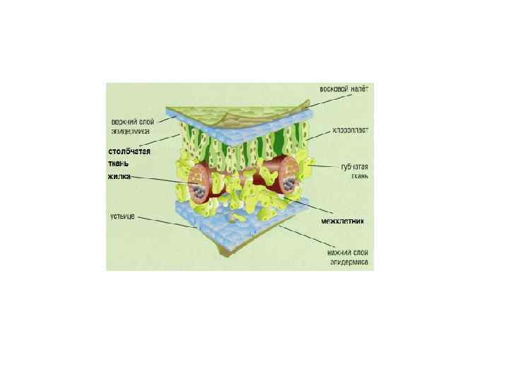 Внутреннее строение листа: 1 — кутикула; 2 — эпидерма; 3 — ксилема; 4 — флоэма; 5 — волокна; 6 — колленхима; 7 — устьица; 8 — столбчатая хлоренхима; 9 — губчатая хлоренхима; 10 — железистый волосок; 11 — кроющий волосок; 12 — межклетник.