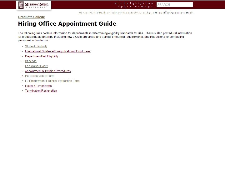 FOREIGN NATIONAL EMPLOYEES Cannot begin working until cleared by International Payroll (see link under “Appointment Steps” for details on clearance process) Not allowed to work over 20 hrs/wk during the FA & SP semesters per US Immigration law Teaching Assistantship eligibility – see link under “Appointment Guide” for details