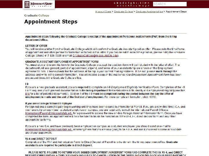 APPOINTMENT STEPS CONT. Students should carefully read & then sign form Return signed form to Graduate College PAF then sent to HR I-9, W-4, and Direct Deposit Forms (complete at the hiring office) ALL new grad assistants Prior to, or on, 1 st day of work Proper ID needed (originals) Sent to Dean’s office for e-Verify