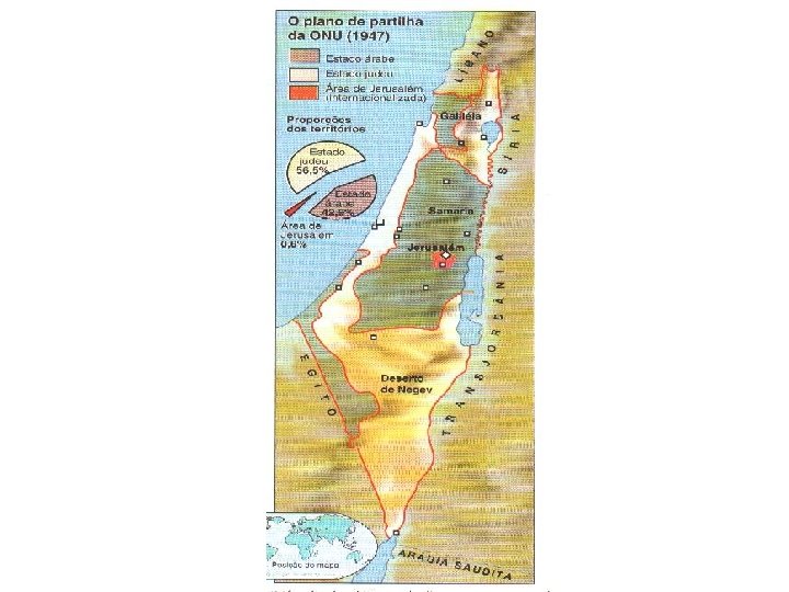 ISRAEL • 2. 000 a. C. – Instalação histórica do povo judeu na Palestina • 1897 – Colonos judeus instalam-se na Palestina • 1909 – Criação do 1º kibutz na Palestina • 1914 – Terras palestinas adquiridas pelo Fundo Nacional Judaico • 1933 a 1945 – Migração de judeus para a Palestina • 1948 - CIAÇÃO DO ESTADO DE ISRRAEL