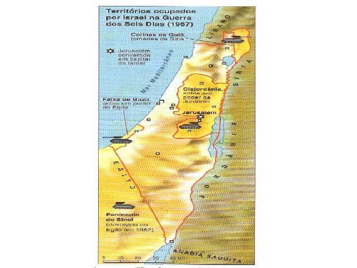 A GUERRA DOS SEIS DIAS - 1967 -Em 28 de maio de 1967, havia um pacto de defesa entre a Jordânia, o Egito, o Iraque e a Síria. As chances de Israel sobreviver eram remotas. -Diante dessa ameaça, na manhã de 5 de julho de 1967, Israel tomou a iniciativa e iniciou a guerra - Vitória de Israel