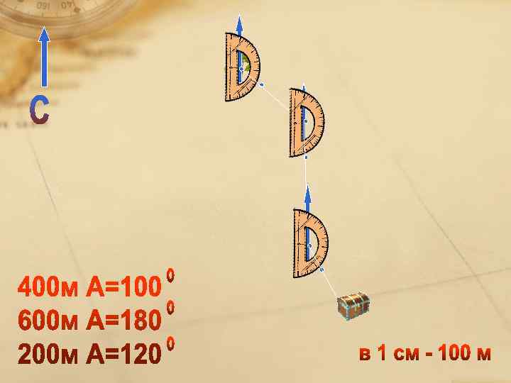 Пройти от растущего на поляне дуба 400 м по азимуту 100°, а затем 600 м по азимуту 180° и 200 м по азимуту 120 °.