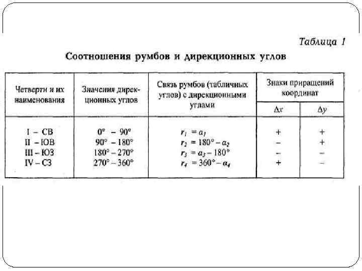Название четвертей составлены из соответствующих обозначений главных точек горизонта: север (С), юг (Ю), восток (В), запад (З). Зависимость между дирекционными углами и румбами определяется для четвертей по следующим формулам: I четверть (СВ) r = α II четверть (ЮВ) r = 180° – α III четверть (ЮЗ) r = α – 180° IV четверть (СЗ) r = 360° – α