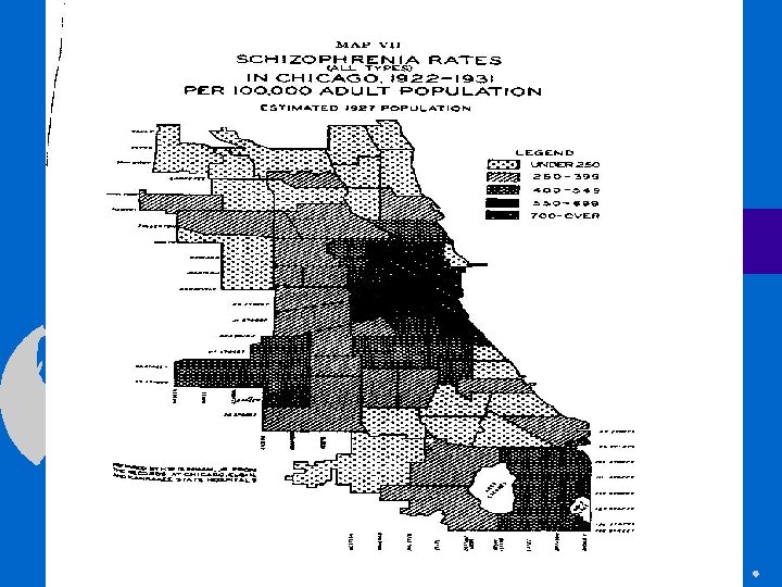 FARIS AND DUNHAM • CHICAGO 1939 • ADMISSIONS TO MENTAL HOSPITALS BY AREAS OF CITY • NO ASSOCIATION BETWEEN RESIDENCE AND BI-POLAR