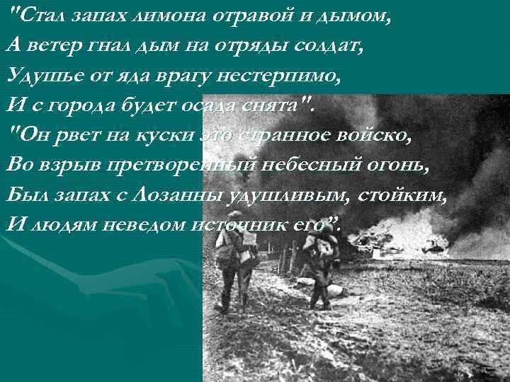 "Стал запах лимона отравой и дымом, А ветер гнал дым на отряды солдат, Удушье от яда врагу нестерпимо, И с города будет осада снята". "Он рвет на куски это странное войско, Во взрыв претворенный небесный огонь, Был запах с Лозанны удушливым, стойким, И людям неведом источник его”.