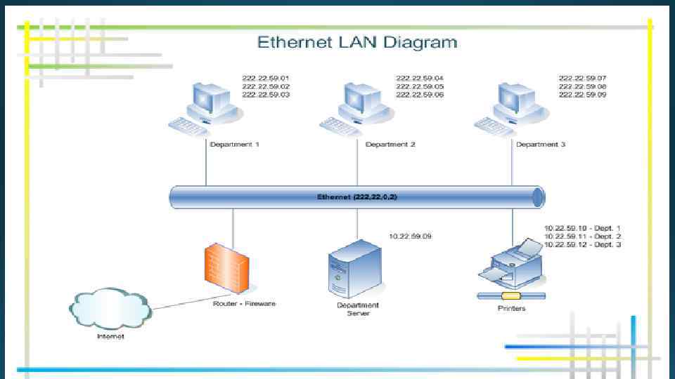 Ethernet (ether «эфир» ) – деректерді таратудың пакеттік технологиясы. Ethernet страндарттары физикалық деңгейде электр дабылдары мен сымдық қосылыстарды, кадрлардың форматын және ортаға қатынауды басқару протоколын анықтайды – арналық деңгейдегі моделі OSI. Ethernet 1990 - жылдардың ортасында ең көп таратылған технология