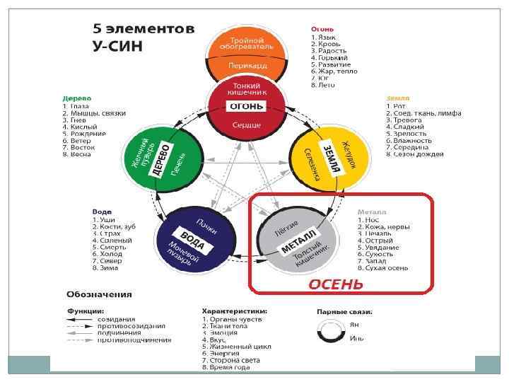 Согласно теории Пяти первоэлементов, осень соотносится с элементом Металл, сухостью, легкими, носом, выделениями из носа, кожей, белым цветом, движением внутрь, плодоношением, тоской, толстым кишечником.