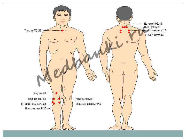 Некоторые общие акупунктурные рецепты для постановки банок в сезон «Шуанцзян» : Профилактика заболеваний органов дыхания: Да-чжуй VG. 14, Дин-чуань ВТ, Фэн-мэнь V. 12, Фэй-шу V. 13, Тянь-ту VC. 22. Метод укрепления организма: Цзу-сань-ли E. 36. Профилактика простудных заболеваний: Да-чжуй VG. 14. Профилактика и лечение боли в области коленного сустава: Хэ-дин ВТ, Вай-си-янь ВТ (соответствует точке Ду -би E. 35), Нэй-си-янь ВТ, Ян-лин-цюань VB. 34, Инь-линцюань RP. 9, Цзу-сань-ли E. 36, точки А-ши. Из приведенных выше групп точек, используйте только подходящие для состояния Вашего организма.