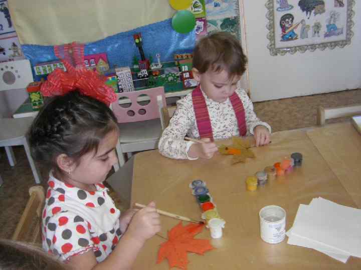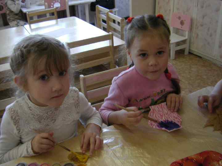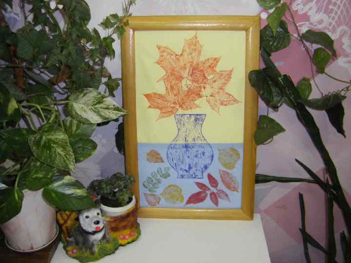 ПОСЛЕДОВАТЕЛЬНОСТЬ ВЫПОЛНЕНИЯ РАБОТЫ выбор и раскладывание на холсте листьев для будущей композиции, обсуждение цвета v нанесение краски на сухие листья v выполнение печати на холсте v помещение холста в рамку v выбор места в групповой комнате для размещения композиции v