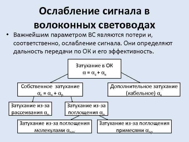Ослабление сигнала в волоконных световодах • Важнейшим параметром ВС являются потери и, соответственно, ослабление сигнала. Они определяют дальность передачи по ОК и его эффективность. Затухание в ОК α = αс + αк Собственное затухание αc = αn + αp Затухание из-за рассеивания αn Дополнительное затухание (кабельное) αк Затухание из-за поглощения αp Затухание из-за поглощения молекулами αnm Затухание из-за поглощения примесями αnp