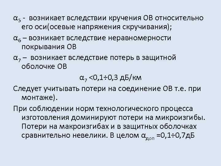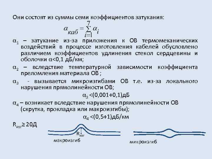 Они состоят из суммы семи коэффициентов затухания: α 1 – затухание из-за приложения к ОВ термомеханических воздействий в процессе изготовления кабелей обусловлено различием коэффициентов удлинения стекол сердцевины и оболочки α<0, 1 д. Б/км; α 2 – вследствие температурной зависимости коэффициента преломления материала ОВ ; α 3 - вызывается микроизгибами ОВ т. е. из-за локального нарушения прямолинейности ОВ; α 3 <(0, 001÷ 0, 1)д. Б α 4 – возникает вследствие нарушения прямолинейности ОВ (скрутка, прокладка или макроизгибы); α 4 <(0, 5÷ 1)д. Б/км Rизг≥ 20 Д Rизг макроизгиб микроизгиб