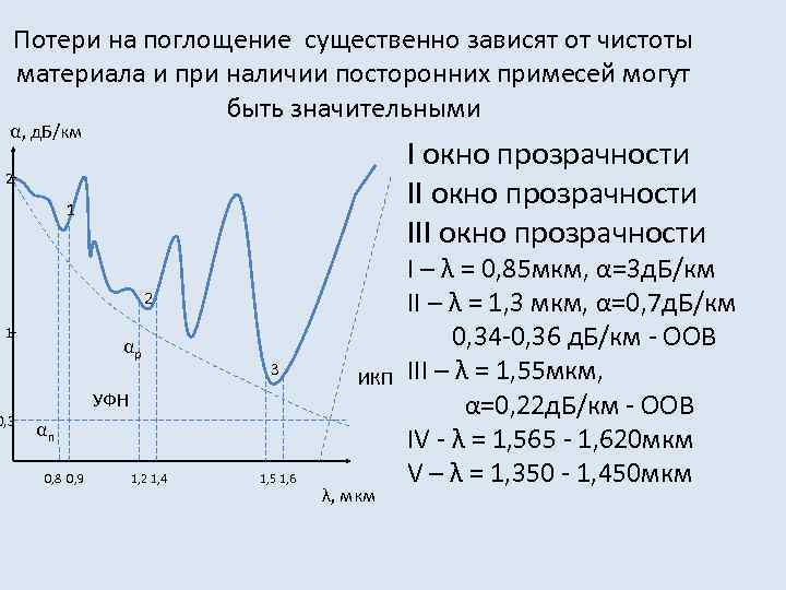 Потери на поглощение существенно зависят от чистоты материала и при наличии посторонних примесей могут быть значительными α, д. Б/км I окно прозрачности III окно прозрачности 2 1 0, 3 αp 3 УФН ИКП αn 0, 8 0, 9 1, 2 1, 4 1, 5 1, 6 λ, мкм I – λ = 0, 85 мкм, α=3 д. Б/км II – λ = 1, 3 мкм, α=0, 7 д. Б/км 0, 34 -0, 36 д. Б/км - ООВ III – λ = 1, 55 мкм, α=0, 22 д. Б/км - ООВ IV - λ = 1, 565 - 1, 620 мкм V – λ = 1, 350 - 1, 450 мкм