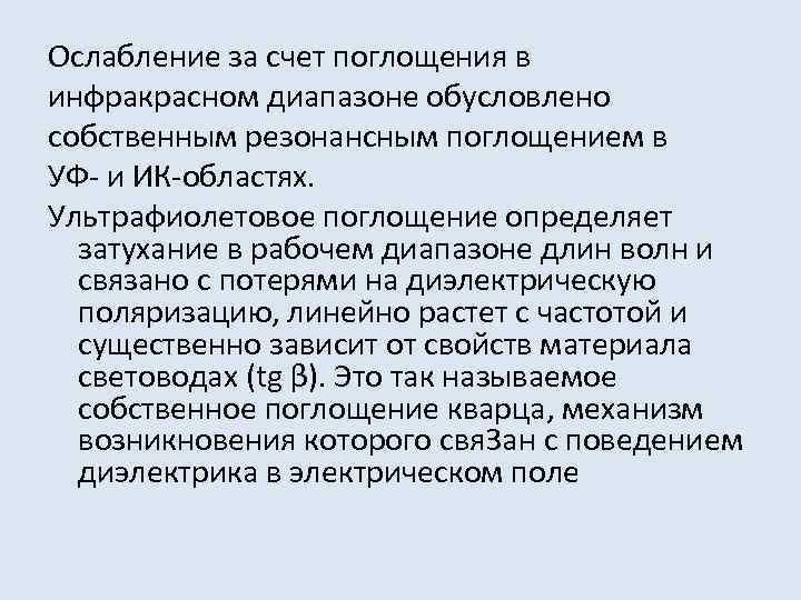 Ослабление за счет поглощения в инфракрасном диапазоне обусловлено собственным резонансным поглощением в УФ- и ИК-областях. Ультрафиолетовое поглощение определяет затухание в рабочем диапазоне длин волн и связано с потерями на диэлектрическую поляризацию, линейно растет с частотой и существенно зависит от свойств материала световодах (tg β). Это так называемое собственное поглощение кварца, механизм возникновения которого свя 3 ан с поведением диэлектрика в электрическом поле