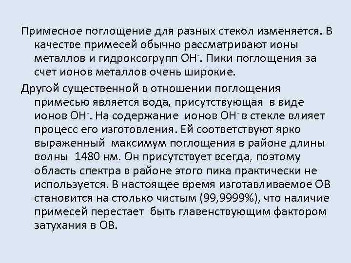 Примесное поглощение для разных стекол изменяется. В качестве примесей обычно рассматривают ионы металлов и гидроксогрупп OH-. Пики поглощения за счет ионов металлов очень широкие. Другой существенной в отношении поглощения примесью является вода, присутствующая в виде ионов OH-. На содержание ионов OH- в стекле влияет процесс его изготовления. Ей соответствуют ярко выраженный максимум поглощения в районе длины волны 1480 нм. Он присутствует всегда, поэтому область спектра в районе этого пика практически не используется. В настоящее время изготавливаемое ОВ становится на столько чистым (99, 9999%), что наличие примесей перестает быть главенствующим фактором затухания в ОВ.