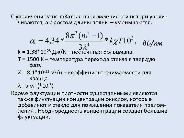 С увеличением пока 3 ателя преломления эти потери увеличиваются, а с ростом длины волны – уменьшаются. д. Б/км k = 1. 38*1023 Дж/К – постоянная Больцмана, T = 1500 К – температура перехода стекла в твердую фазу Χ = 8, 1*10 -11 м 2/н - коэффициент сжимаемости для кварца λ - в м! (*10 -6) Кроме флуктуации плотности существенными являются также флуктуации концентрации окислов, которые добавляют в стекло для повышения показателя преломления. Неоднородность концентрации создает большие флуктуации.