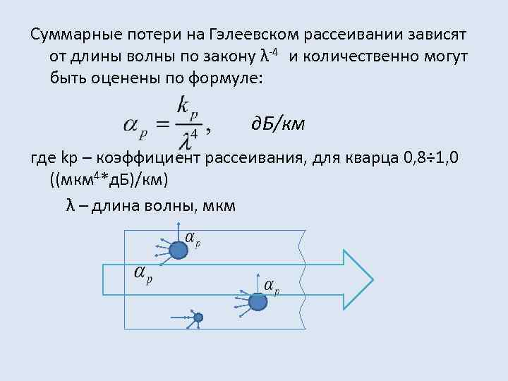 Суммарные потери на Гэлеевском рассеивании зависят от длины волны по закону λ-4 и количественно могут быть оценены по формуле: д. Б/км где kp – коэффициент рассеивания, для кварца 0, 8÷ 1, 0 ((мкм 4*д. Б)/км) λ – длина волны, мкм
