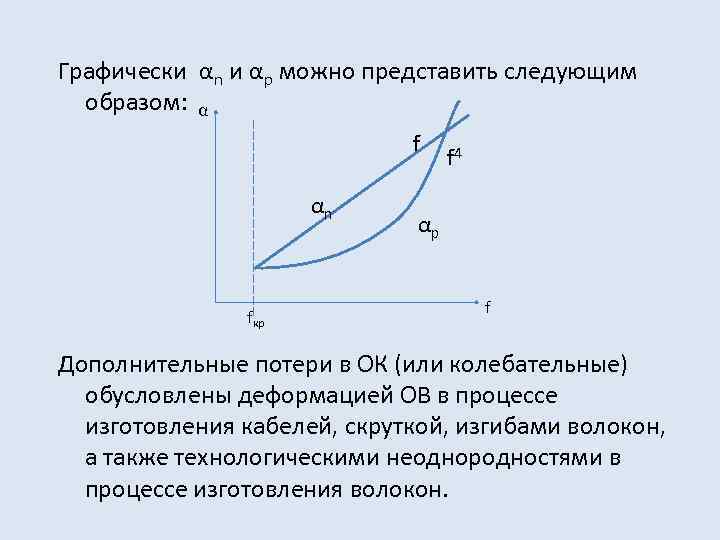Графически αn и αp можно представить следующим образом: α f αn fкр f 4 αp f Дополнительные потери в ОК (или колебательные) обусловлены деформацией ОВ в процессе изготовления кабелей, скруткой, изгибами волокон, а также технологическими неоднородностями в процессе изготовления волокон.