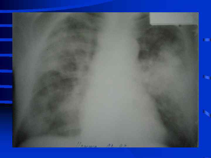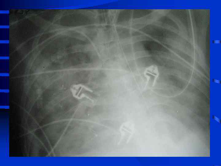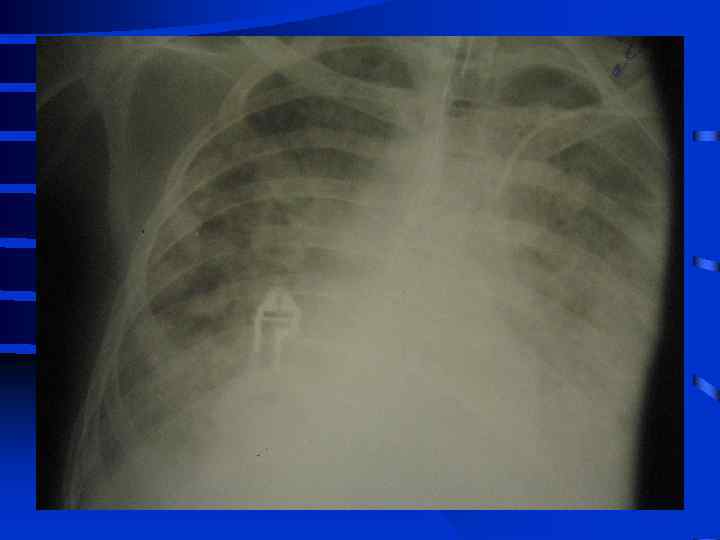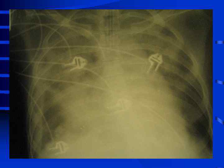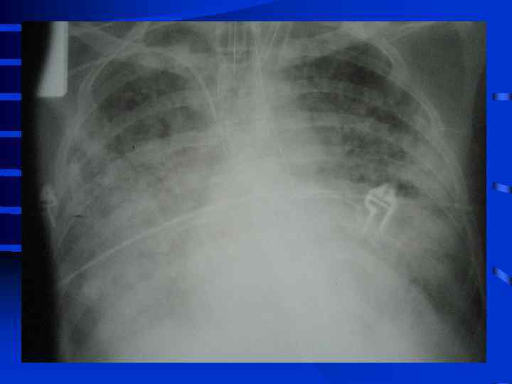 Объективные признаки развития ОРДС • 1. Индекс оксигенации снижен • 2. Симметричные рентгенографические изменения инфильтративного характера • 3. Увеличение внутрилегочного шунта (более 25% от величины МОК) • 4. Возрастание альвеолярно-артериальной разницы по кислороду (более 250 мм. рт. ст. при Fi. O 2 = 1, 0) • 5. Легочная гипотензия (PCWP не более 12 мм. рт. ст. ) • 6. Уменьшение растяжимости (податливости) легких 50 мл/см. вод. ст. и менее