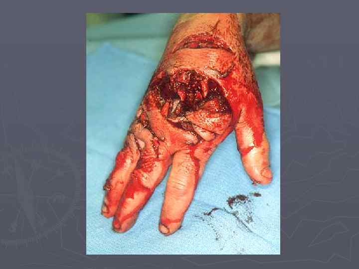 Изменения тканей при СДР Длительное сдавливание и связанное с этим нарушение кровоснабжения, ведет к развитию гангрены раздавленной конечности. ► Ограниченный некроз кожи выявляется через 4 -5 дней после травмы на месте небольшого раздавливания тканей. Омертвевшая кожа отторгается через 8 -9 дней, на этом участке появляется рана с ровными краями. ► Флегмона в течение синдрома длительного сдавления, возникают с проникновением инфекции в поврежденные и раздавленные мышцы либо из поверхностных инфицированных кожных ссадин и ран, либо из ран, возникающих в связи с некрозом кожи или, наконец, из ран, специально нанесенных с целью ослабления напряжения тканей пораженной конечности. Особенностью этих флегмон является обширность их и трудность диагностики. ►