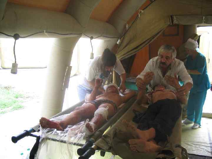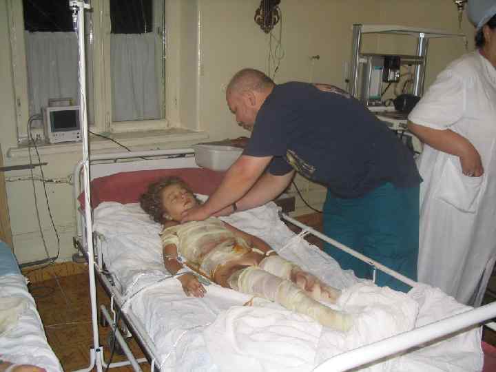 ► В специализированной машине скорой помощи – аспирация из трахеи и бронхов, интубация трахеи. ИВЛ аппаратом или мешочком Амбу. Ликвидация гиповолемии критической степени (струйное введение кристаллоидов и коллоидов в 2 вены). Устранение ацидоза (трис – буфер, лактосоль) внутривенно струйно. ► Обезболивание – наркотические и ненаркотические анальгетики. ► Транспортная иммобилизация стандартными шинами (лестничные шины, пневматические шины, специальный «вакуумный» матрацносилки.