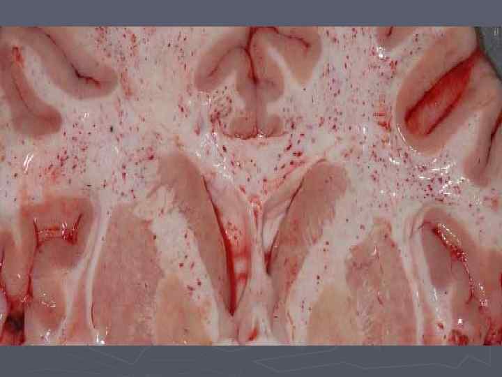 — рано возникающая острая дыхательная недостаточность; ► — стойкая немотивированная тахикардия (выше 90 в мин) считается ранним признаком развития синдрома жировой эмболии. В более тяжелых случаях — тахиаритмии и синдром малого выброса, связанные как с непосредственным поражением миокарда гипоксического, дисциркуляторного и эндотоксического характера, так и с легочной гипертензией. ► — петехиальные высыпания специфической локализации (на коже щек, шеи, груди, плечевого пояса и в конъюнктиве. Считается, что они являются проявлением капилляропатии вследствие действия свободных жирных кислот. Появляются на 2 -3 сутки (или через 12 -18 часов после ухудшения состояния больного) и подвергаются обратному развитию к концу 1 недели; ► — гипертермия по типу постоянной лихорадки (до 3940°С. ); ► Инструментально-лабораторные критерии: — наличие капель нейтрального жира размером 6 мкм в биологических жидкостях. ►