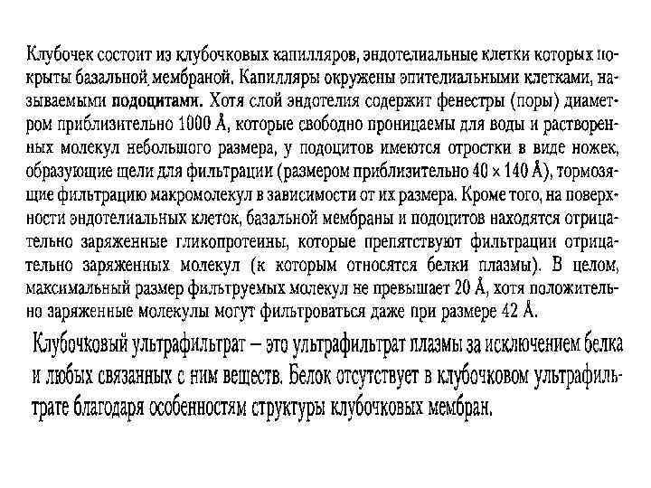 А Б Рис. А. Связь подоцитов с эндотелием капилляров. Подоциты — видоизменённые эпителиальные клетки внутреннего листка капсулы. Они образуют большие ножки, от которых отходят многочисленные нитевидные малые ножки. Уплощённые эндотелиальные клетки капилляров клубочка имеют многочисленные фенестры. Между внутренним листком капсулы и эндотелием капилляров формируется общая базальная мембрана. Рис. Б. Фильтрационный барьер. Малые ножки подоцитов прикрепляются к трёхслойной базальной мембране, общей для подоцитов и эндотелия капилляров клубочка. Между ножками подоцитов имеются узкие (30– 40 нм) фильтрационные щели, затянутые фильтрационной диафрагмой — главным компонентом барьера.