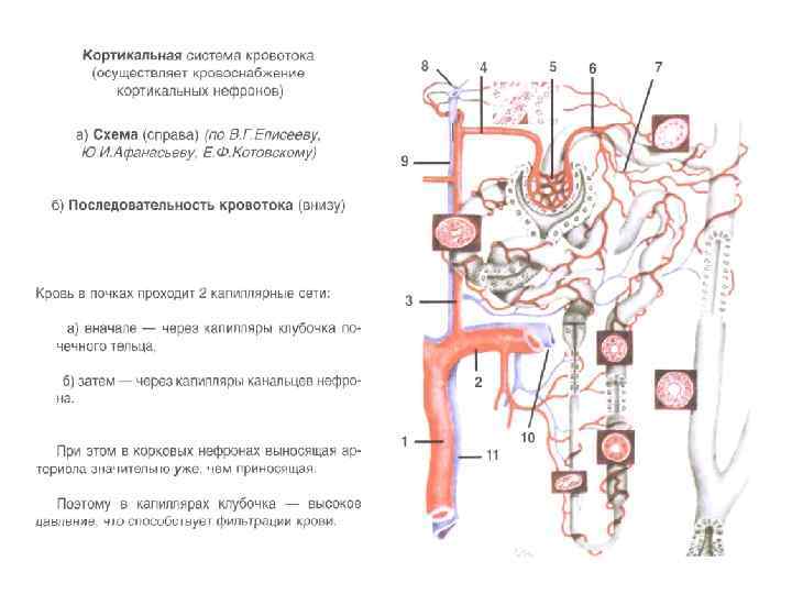 Рис. Почка лошади: 1 – капсула; 2 – корковое вещество; 3 – мозговое вещество; 4 – мозговые лучи; 5 – бертильевы колонки; 6 – почечное тельце; 7 – извитые канальцы; 8 – прямые канальцы; 9 – петля Генле; 10 – собирательные трубки
