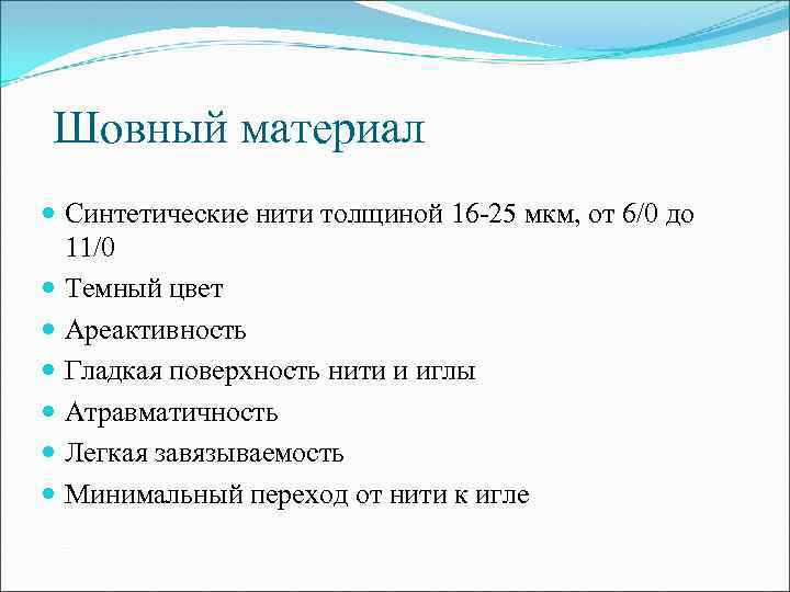 Шовный материал Синтетические нити толщиной 16 -25 мкм, от 6/0 до 11/0 Темный цвет Ареактивность Гладкая поверхность нити и иглы Атравматичность Легкая завязываемость Минимальный переход от нити к игле