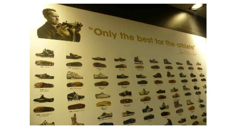 ГОД История 1920 Вскоре после Первой мировой войны, в начале 1920 Дасслеры на семейном совете решили организовать семейное дело — пошив обуви. Первой продукцией семьи Дасслер были домашние тапочки и ортопедическая обувь для тренировок спортсменовинвалидов (которых было много после войны). Материалом для них служило списанное военное обмундирование, а подошвы вырезали из старых автомобильных покрышек. 1924 К производству подключился и старший брат Адольфа, Рудольф. 1 июля 1924 г. основана «Обувная фабрика братьев Дасслер» . Два брата с противоположными характерами дополняют друга — Адольф — спокойный и уравновешенный производитель, в то время, как Рудольф — активный и коммуникабельный продавец. Ади был усидчивым дизайнером, а Рудольф отлично справлялся с коммерческими аспектами их предприятия. Сначала производство состояло из 12 Футбольные бутсы 1920 человек, и производили они всего 50 пар обуви в день.