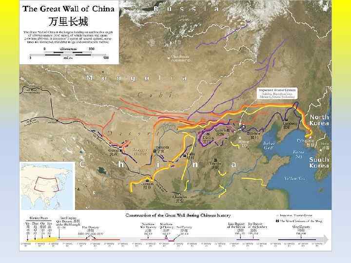 Длина 8851, 8 км Стена имеет ширину у основания около 9 м и на вершине около 6 м, высота стены достигает 10 м. Примерно через каждые 200 м — четырёхугольные сторожевые башни, а с внешней стороны стены — высокие оборонительные зубцы с отверстиямиамбразурами.