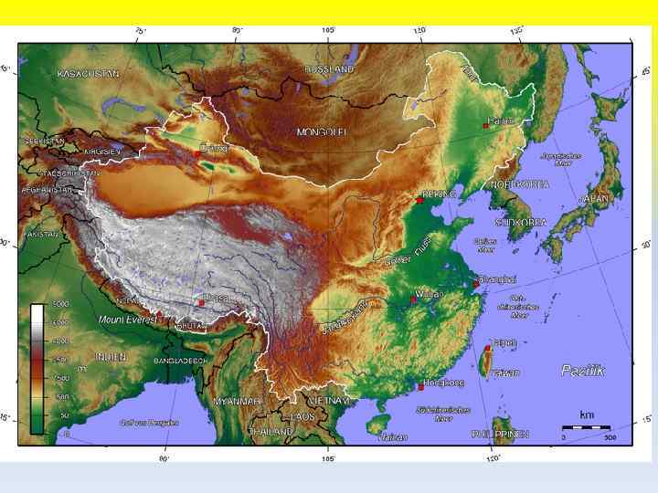 ТИБЕТСКОЕ НАГОРЬЕ - высотой более 2000 м над уровнем моря расположено на юго-западе страны; ПОЯС ГОР И ВЫСОКИХ РАВНИН - высоты 200— 2000 м, находится в северной части; НИЗКИЕ АККУМУЛЯТИВНЫЕ РАВНИНЫ - ниже 200 м и невысокие горы на северо-востоке, востоке и юге страны, где проживает бо льшая часть населения Китая. Самая высокая точка мира – Эверест – 8848; Вторая впадина - Турфанская - -154