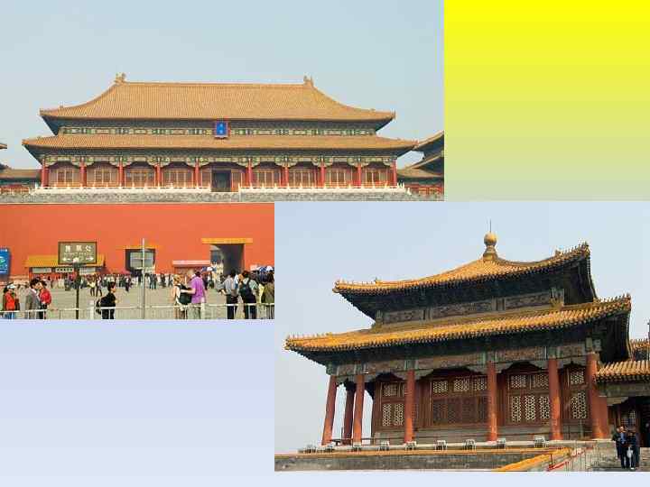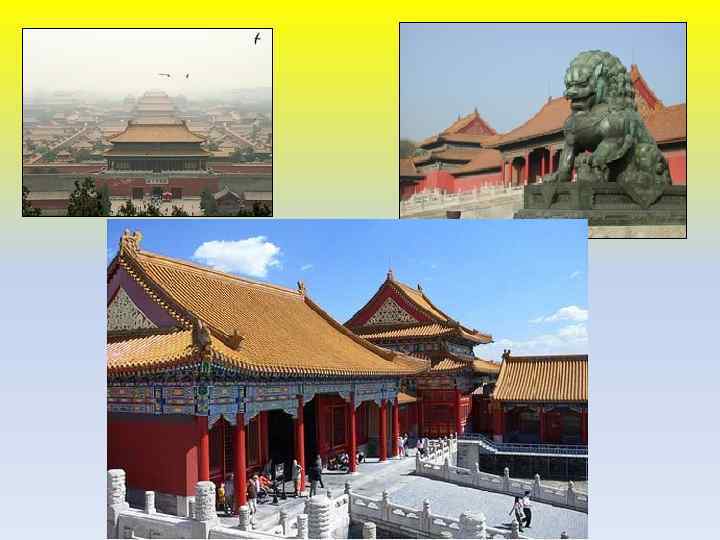Запретный город 紫禁城 Общая площадь — 720 тыс. кв. м; дворцовый комплекс насчитывает 9999 комнат. Окружен стеной длиной 3400 м и рвом с водой, который называется «Золотая вода» . В его возведении принимали участие миллион строителей и 100 тысяч других специалистов — мастеров резьбы по камню, дереву, художников и т. д.