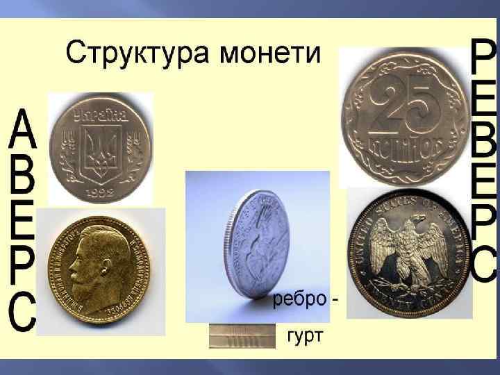 Поняття «монета» . Назва монети і її номінал Монета – це злиток металу визначеної форми, ваги, проби і якості, який слугує узаконеним засобом платежу. Назва монети – відображає назву грошової одиниці або її фракції Британський фунт стерлінгів = 20 шилінгів = 240 пенні Рубль-копійка Юань – цзянь - финь Єгипетський фунт – піастр - мільєм