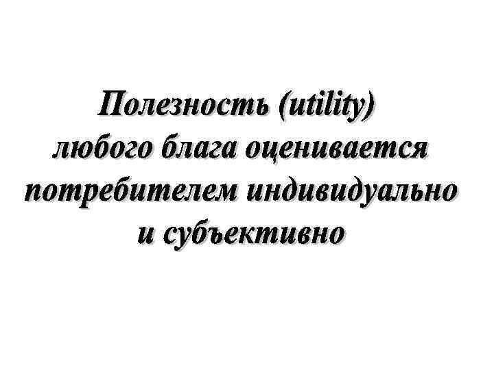 Кардиналистская (количественная) полезность • Субъективная полезность, которую потребитель получает от использования продукта, измеренная в абсолютных величинах (рублях, «ютилях» , … ) • Подразумевается, что можно измерить точную величину полезности, извлекаемой при потреблении продукта