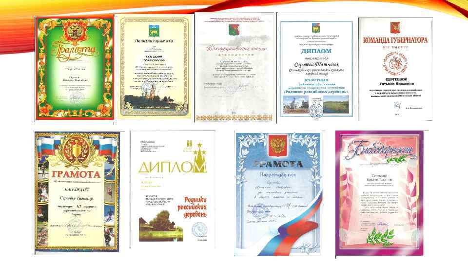 ЗА АКТИВНУЮ ЖИЗНЕННУЮ ПОЗИЦИЮ ТАТЬЯНА ПАВЛОВНА НАГРАЖДЕНА БЛАГОДАРСТВЕННЫМИ ПИСЬМАМИ, ГРАМОТАМИ, ДИПЛОМАМИ