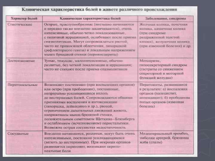Характеристика вісцерального та соматичного болю Ознаки Вісцеральний Соматичний Характер Давлячий, спастичний, тупий Гострий інтенсивний Локалізація Дифузний, по серединній лінії Тривалість Від хвилини до місяців Ритмічність (зв’язок із прийомом їжі, періодом доби, актом дефекації) Характерна (ритм може бути правильним та неправильним) Відсутня Іррадіація Виника при Присутня в більшості інтенсивному випадків характері і відповідає враженому органу