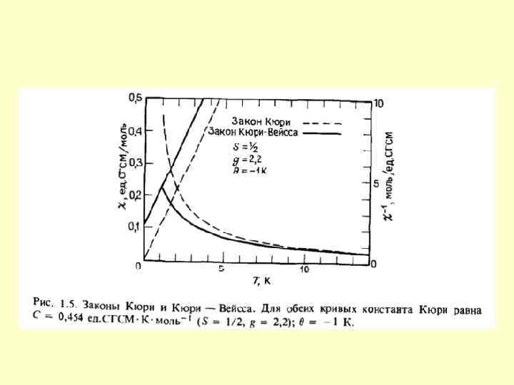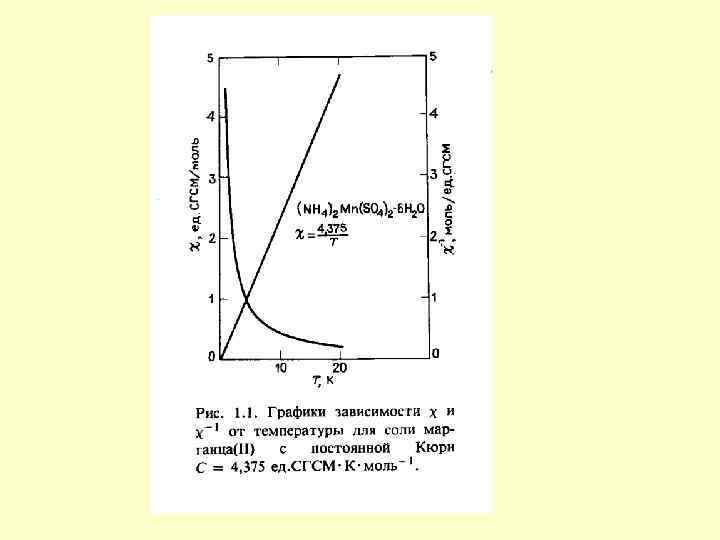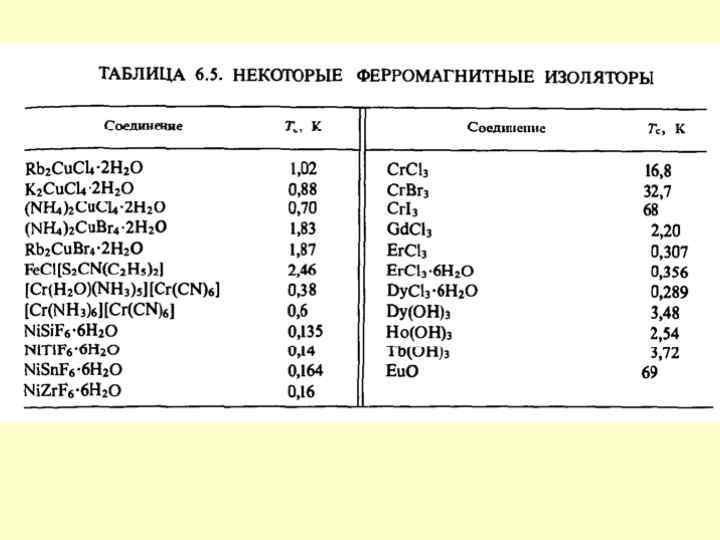Залежність добутку молярної магнітної сприйнятливості на температуру від температури для різних типів магнетиків Феромагнетик Парамагнетик Ферімагнетик Антиферомагнетик T, K