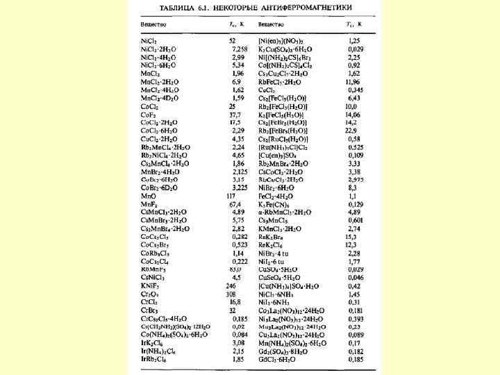 Антиферомагнетизм • Кооперативний магнетизм, що призводить до дальнього упорядкування, при якому за рахунок обмінної взаємодії реалізується тенденція спінів до антипаралельного упорядкування • спонтанна магнетизація відсутня • постійна магнетизація відсутня • критична температура: TN (температура Нееля) • вище TN Þ парамагнетик • AF 0 - 102 • 10 -6 см 3/г • приклади: Mn. O, Mn. S, Mn. Te, Mn. F 2, Fe. Cl 2, Fe. O, Co. O, Ni. O, Co. Cl 2, Ni. Cl 2, Cr