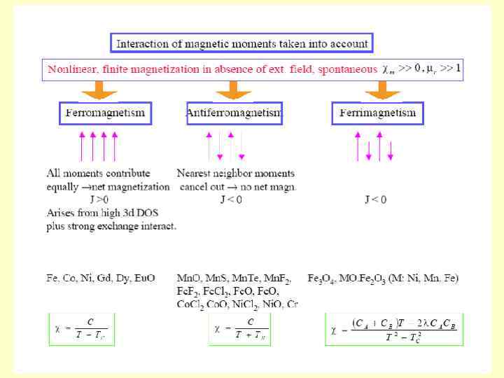 Ферімагнетизм • потрібна наявність двох хімічно нетотожних носіїв неспареної електронної густини з різними моментами • моменти спарюються антиферомагнітно • критична температура: TС (температура Кюрі) • феноменологічна поведінка дуже подібна до феромагнетиків • приклади: магнетит Fe 3 O 4, MO·Fe 2 O 3 (M = Ni, Mn, Fe),