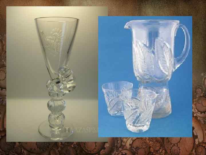• Ленинградский завод художественного стекла, преобразован в 1949 из зеркальной фабрики, где в 1939— 40 по инициативе А. Н. Толстого, скульптора В. И. Мухиной и технолога Н. Н. Качалова был создан цех художественного стекла. В продукции завода как уникальной (декоративные вазы и др. ), так и серийной (сервизы, приборы для воды и др. ), отличающейся классической простотой, строгой архитектоничностью и изысканностью, типично «стеклянные» средства декорировки ( «венецианская нить» , алмазная грань и т. д. ) стали служить выявлению формы предмета. Большая роль в повышении художественного качества изделий Л. з. х. с. принадлежит художникам А. Успенскому, Н. А. Тырсе, В. И. Мухиной, Б. А. Смирнову, А. М. Остроумову, Л. О. Юрген.