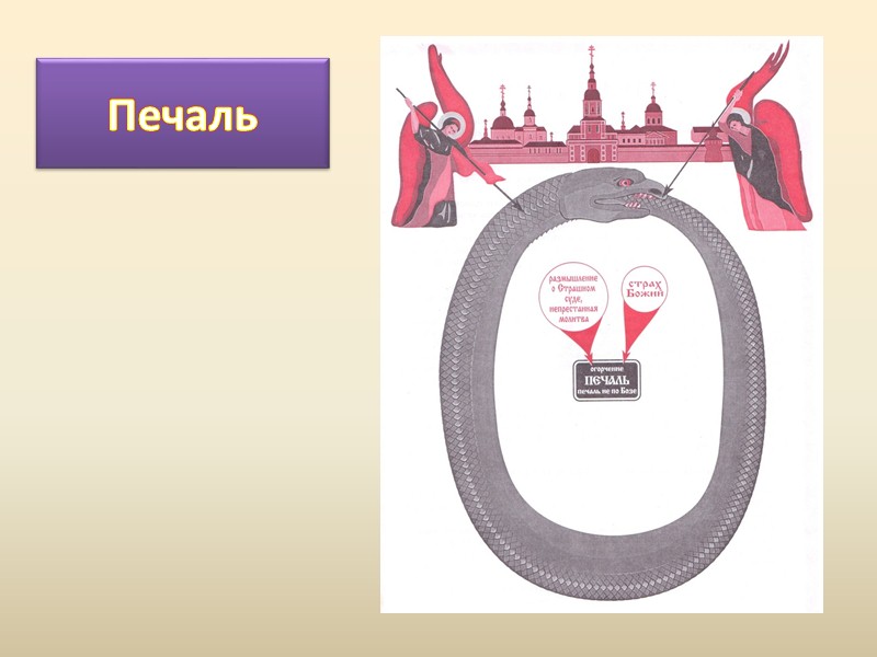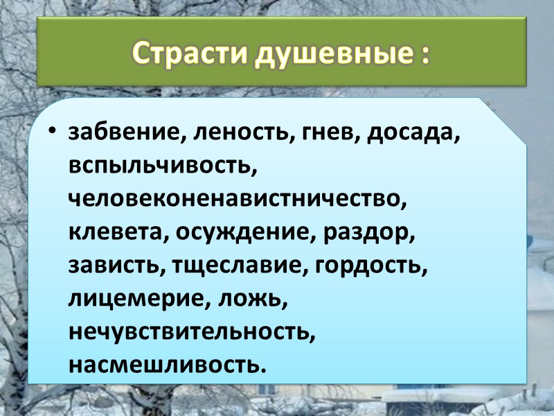 Страсти душевные : забвение, леность, гнев, досада, вспыльчивость, человеконенавистничество, клевета, осуждение, раздор, зависть, тщеславие, гордость, лицемерие, ложь, нечувствительность, насмешливость.